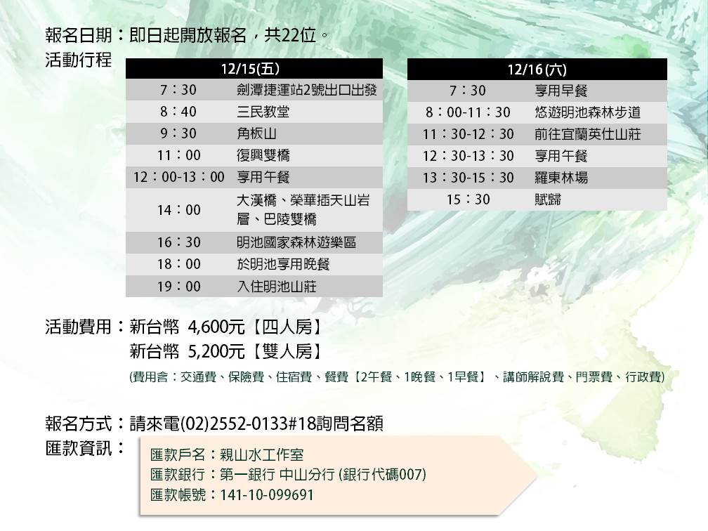 歡迎報名-12/15(五).12/16(六)-北橫明池生態人文體驗活動